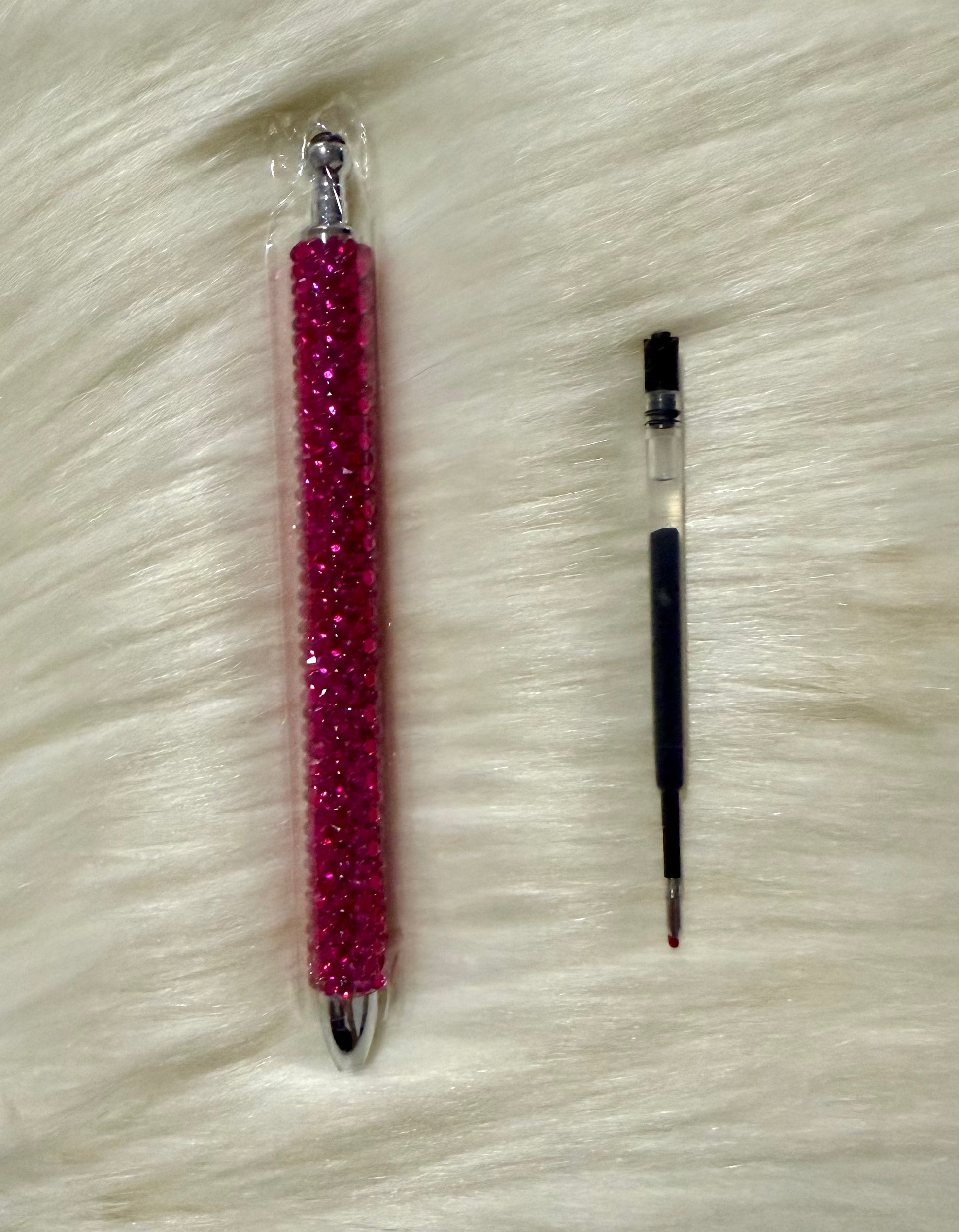 Stainless steel pen covered with glass rhinestones. Includes one ink refill.